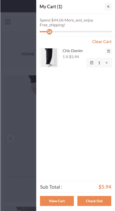 Multikart offers two cart options: a sidebar and a mini cart. The sidebar has a free shipping processbar with a distinctive animation.